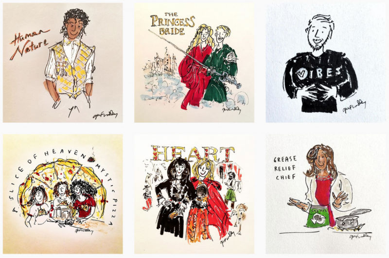 We asked what inspires her to draw. “People fascinate me and I love to sketch them,” said Findley. “And I add a smile. And a headline. I sketch what I see. A moment that tells a story. They’re quick sketches, and they capture a memorable moment or event.”